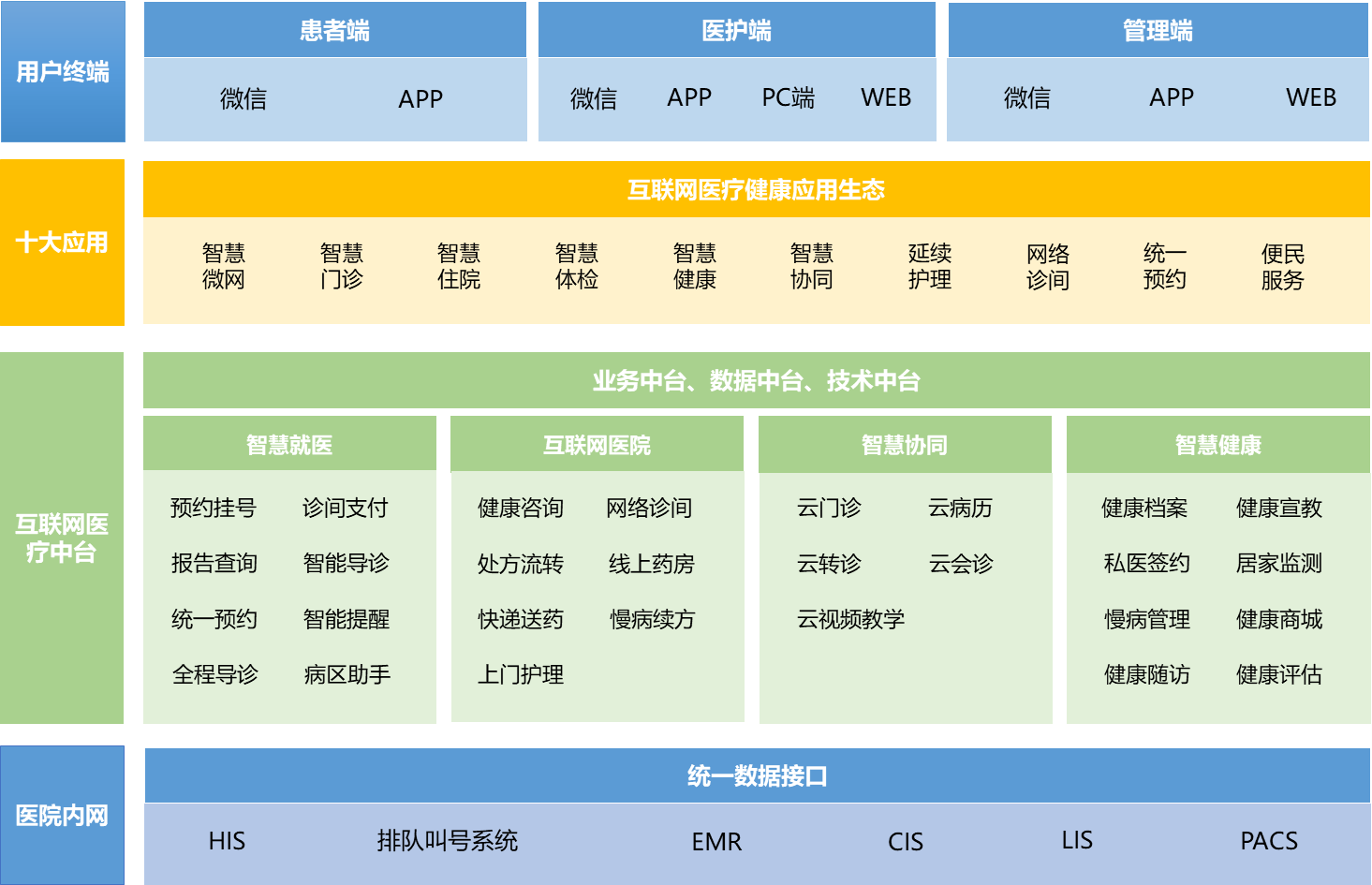本着“以患者为核心”通过互联网、大数据、人工智能、物联网等技术,帮助医院实现“线上线下、院内院外、医疗健康相结合”三合体系的理念。实现便民利民,降本增效,口碑水平双提高。